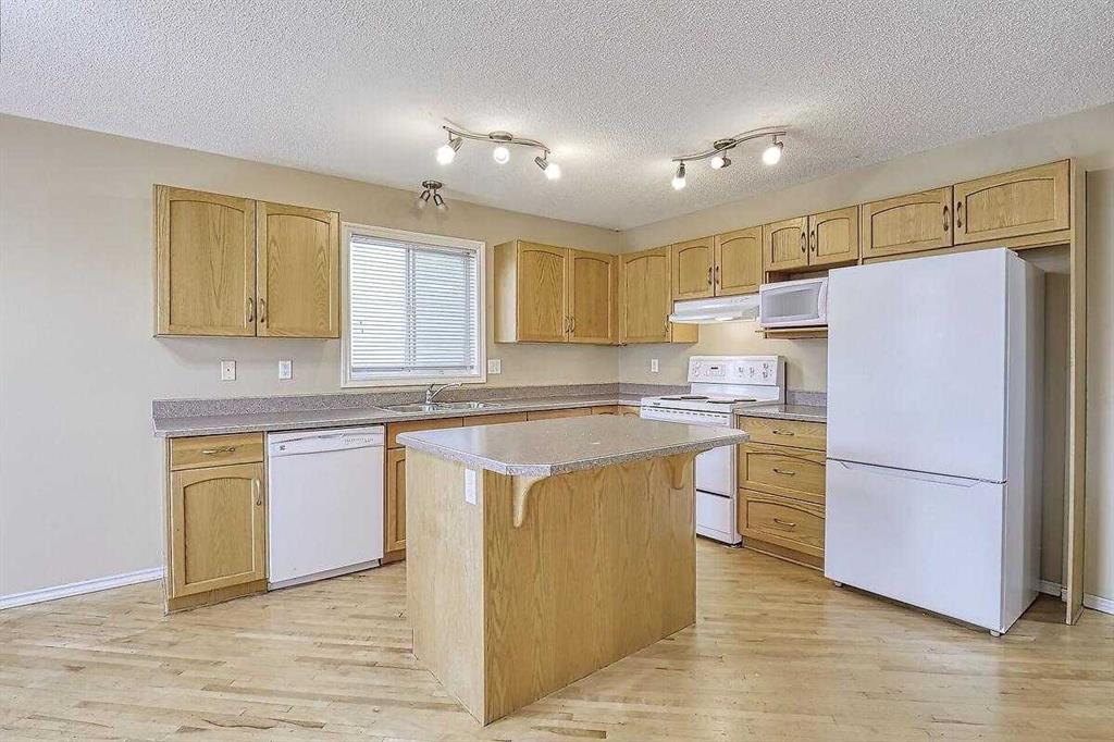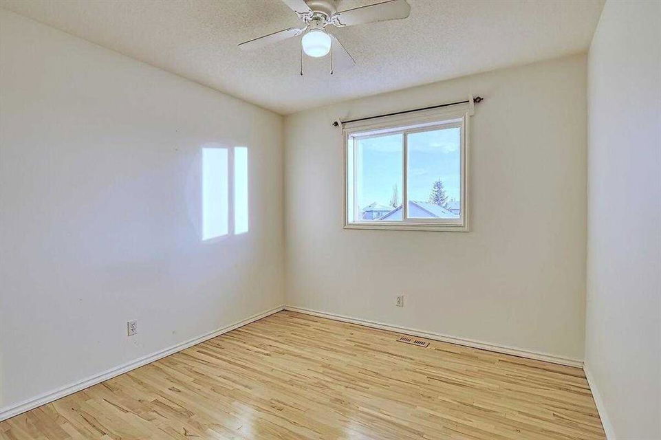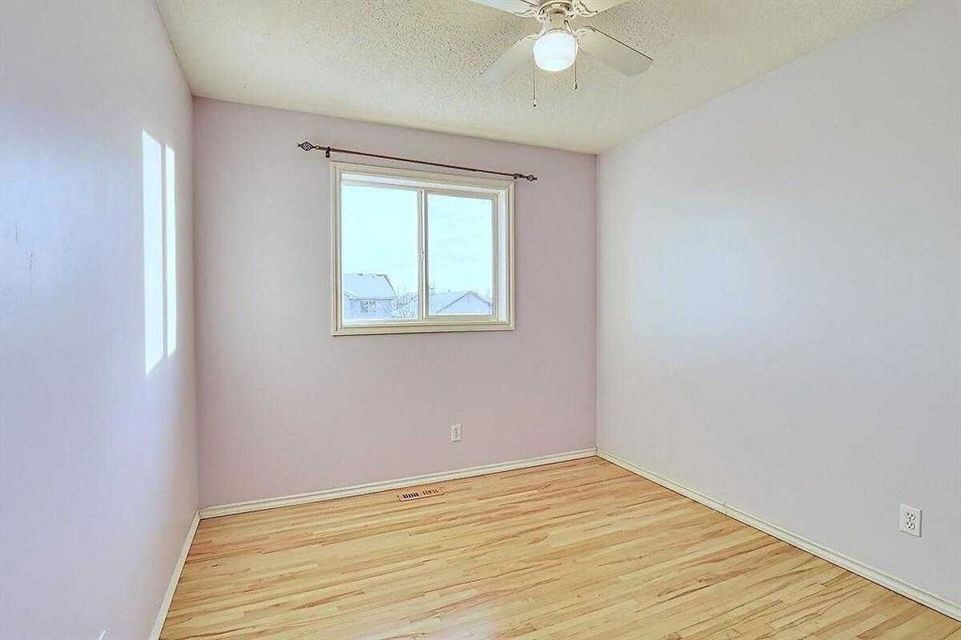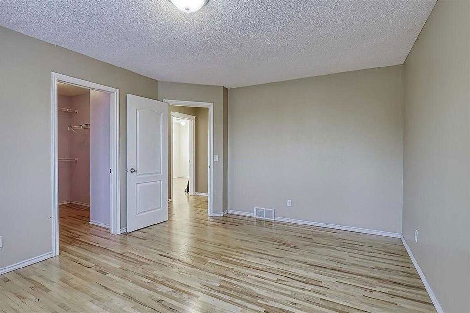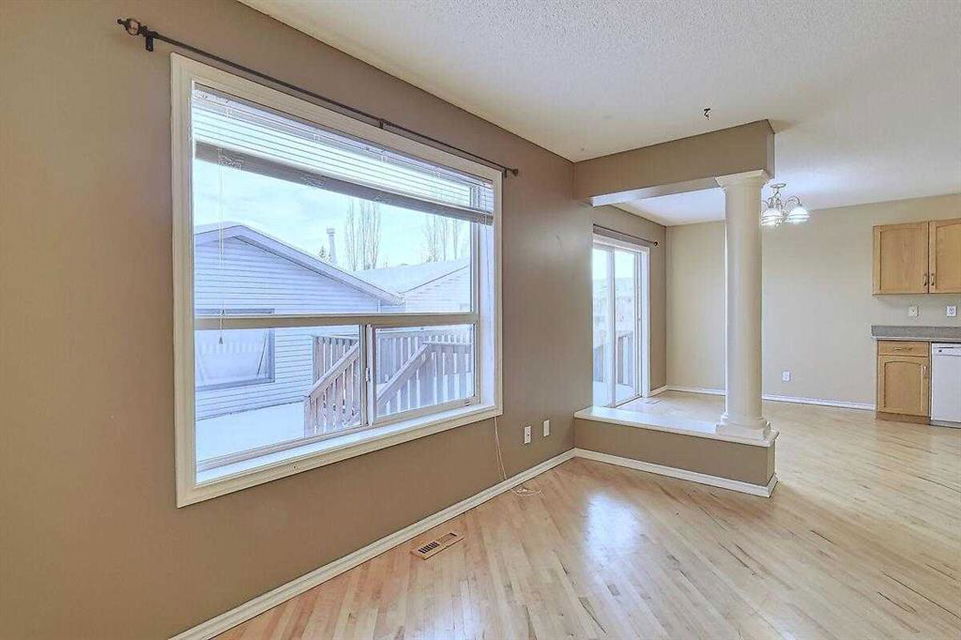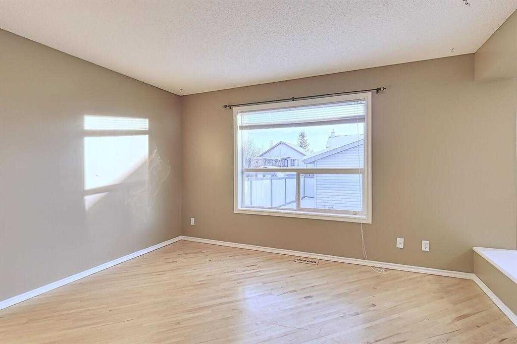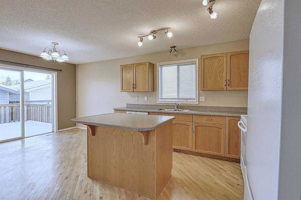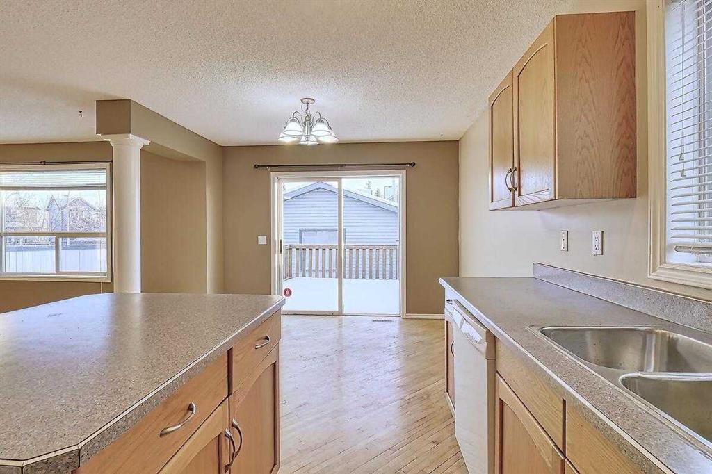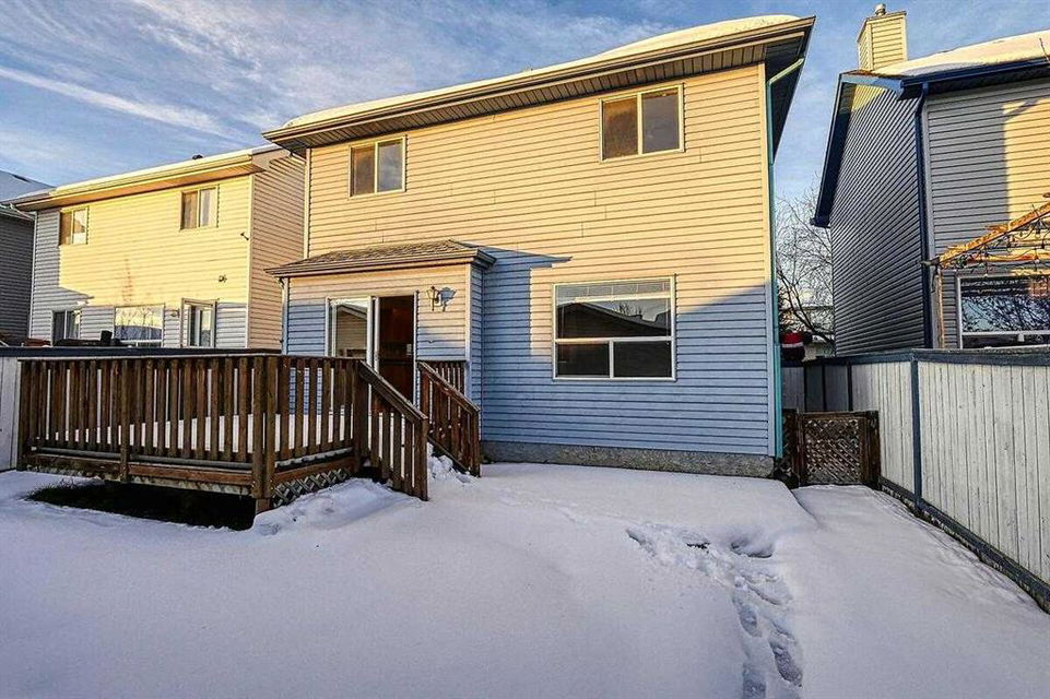Welcome home to this bright and spacious open layout, on a quiet crescent with a sunny south facing backyard. There is solid Hardwood throughout this ENTIRE home. Large open kitchen with a center Island & extra cabinets, an eating nook with bright natural light, a main floor Den/Office, 1/2 bath with an open foyer that is tiled with Hardwood inlay. The house has 3 good size bedrooms, the Master features a sizable walk-in closet, en-suite bathroom with a soaker tub & plenty of natural light. There is an oversize double garage that has heat, cable, telephone, 220 volt hook-ups, standard and fluorescent lighting. The basement has Rough-in plumbing and has a fantastic layout for future development. This home is minutes away from the bus & LRT access, all types of retail and grocery shopping, a YMCA and schools from Kindergarten to Grade 12, as well as quick access to Stoney Trail. An excellent opportunity for a first time home buyer or a mover up.